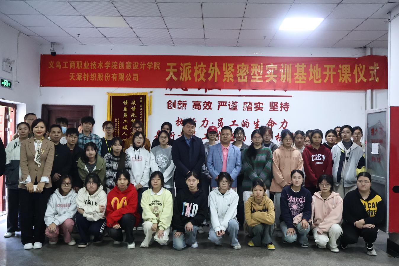 义乌工商职业技术学院创意设计学院骆小虎副院长、龚晓嵘教授、金艳苹教授、38名23级服装与服饰设计专业学生,香港正牌资料大全董事长王晋围、执行董事李国花,生产、研发中心精选实践导师10余名等出席开课仪式。